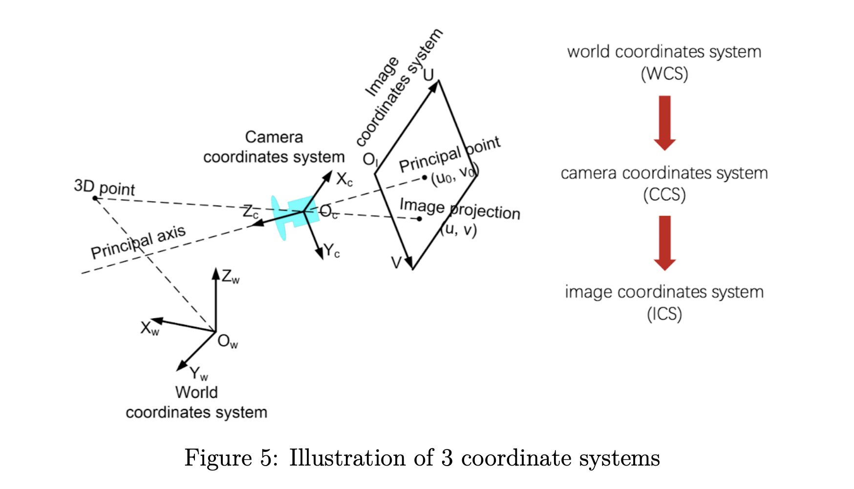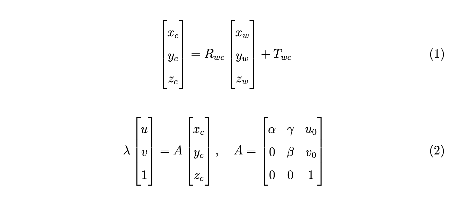 CCS 可以通过对 WCS 执行旋转操作和平移操作来获得,WCS 以方程1中的矩阵形式表示。 ICS 是通过在等式2中表示为 $A$ 的相机固有矩阵的投影获得的。