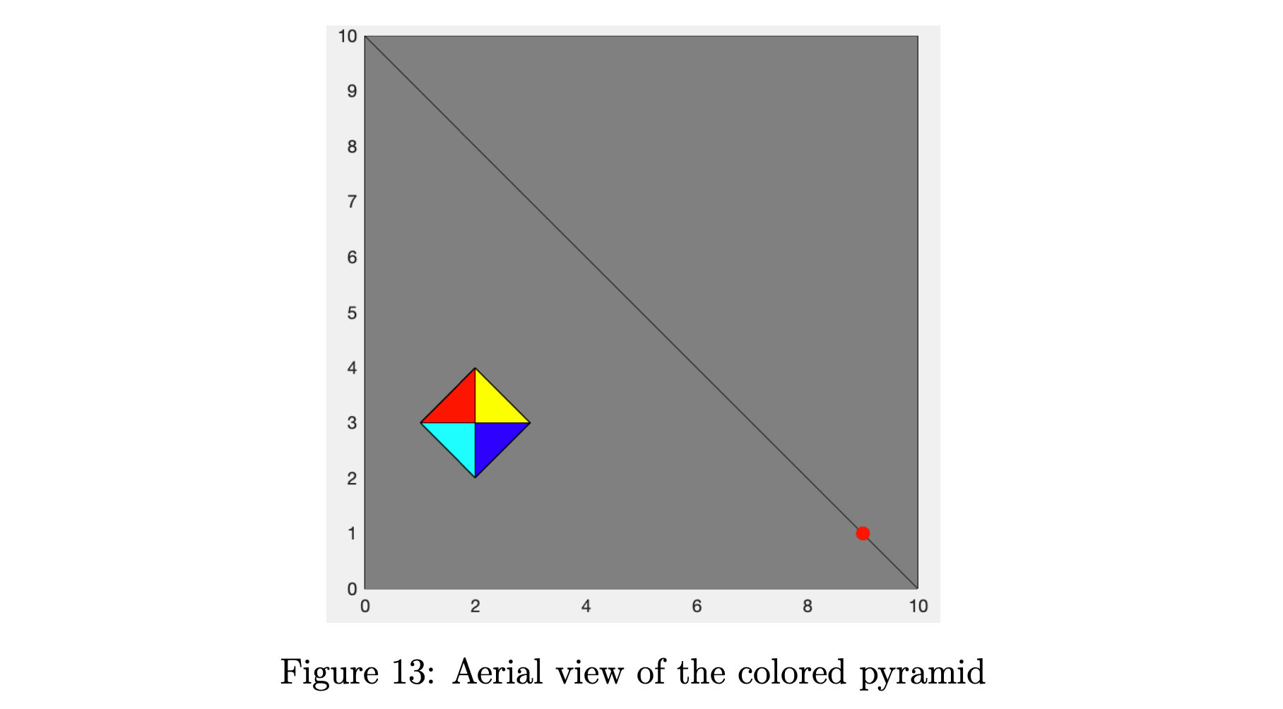 如图 13 所示,我的对象是一个彩色金字塔,可以用 5 个端点 $(-1,0,0)$, $(0,1,0)$, $(1,0,0)$ 表示 , $(0,-1,0)$ 和 $(0,0,1)$。 相机放置在红点位置。