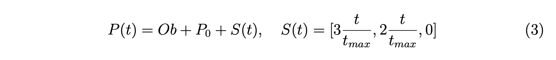在我们的代码中,金字塔的位置由原始的金字塔坐标$Ob$和一个初始位置向量$P_0$组成,其中$Ob$是5个端点$(-1,0,0)$的集合, $(0,1,0)$、$(1,0,0)$、$(0,-1,0)$ 和 $(0,0,1)$。 为了添加平移运动,我们只需要添加一个位移向量 $S(t)$,它是时间 $t$ 的函数。 在我们的实验中,我们简单地选择从初始位置到世界中心的线性位移。 让我们将金字塔的位置表示为 $P(t)$,它是 5 个端点的集合,总时间跨度为 $t_{max}$。 所以 $P(t)$ 可以用方程 3 表示。