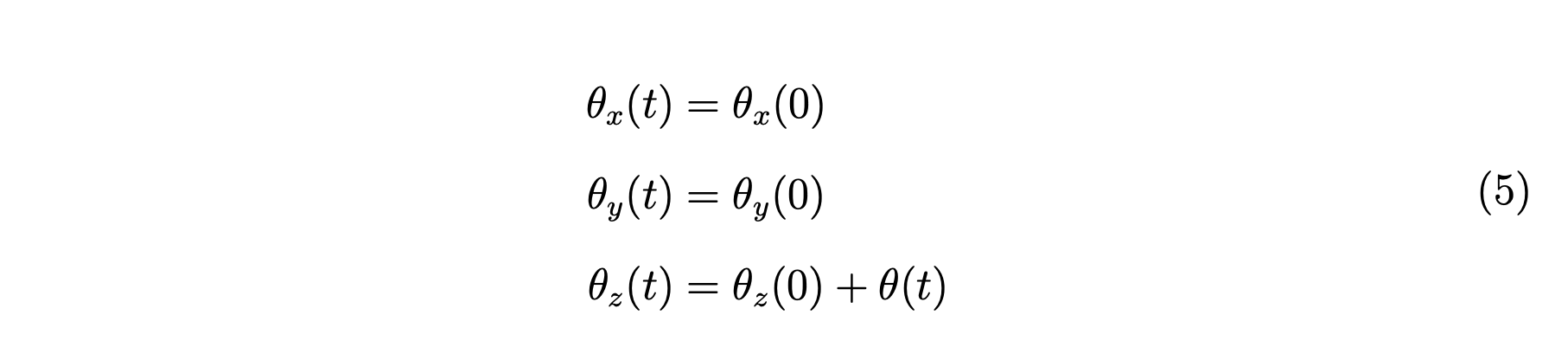 在这部分中,我们将金字塔的位置固定在世界中心 $(5,5,0)$ 上,我们围绕它旋转相机,同时保持相机指向金字塔。 在我们的代码中,相机位置由变量 $camT(t)$ 控制,我们添加相机的旋转,如方程式 4 所示。 指向角由 $\theta_x$、$\theta_y$ 和 $\theta_z$ 控制,其中 $\theta_x$ 分别是围绕 $X$ 轴和其他轴的旋转角度。 由于我们的相机仅在 $XOY$ 平面内旋转,因此我们的角度控制如方程式 5 所示。